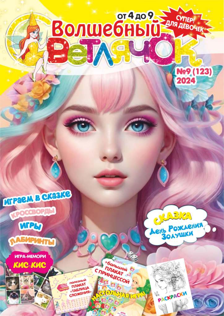 Волшебный Светлячок №09 2024 Сказка «День рождения Золушки», раскраски, игры мемори Кис-Кис