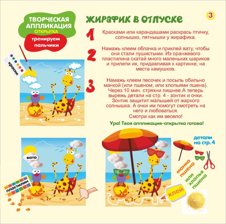 (Используем краски, пластилин, крупы, вату и т.д. Цветную бумагу не придется докупать — все детали уже в журнале ))