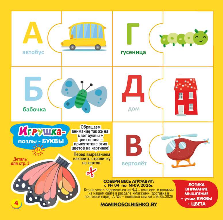 Мамино солнышко №04 2026 Игрушка «Динозаврик», сказка «Кораблики», открытка-аппликация «Жирафик на прогулке», Логические аппликации с деталями «Лодочки», Игрушка-Пазлы «Алфавит» Буквы А,Б,В,Г