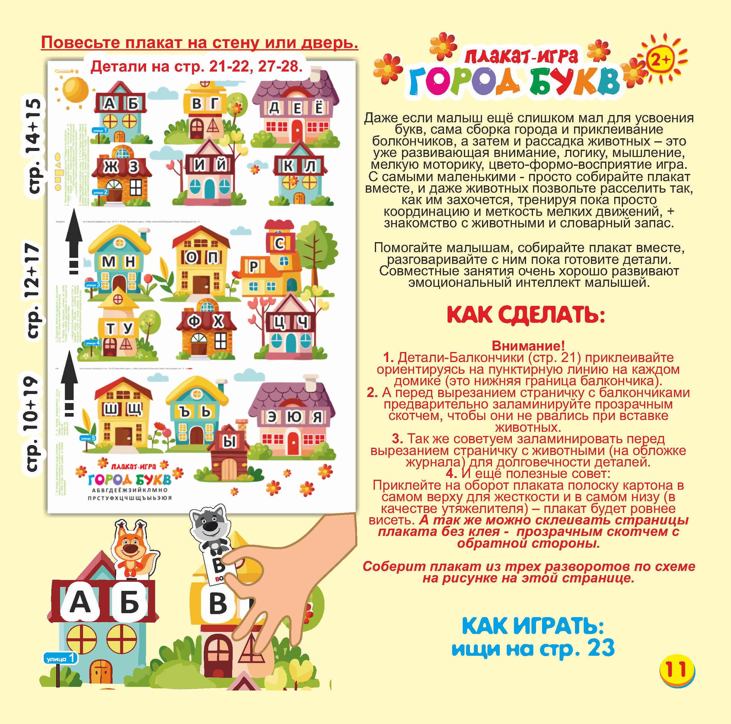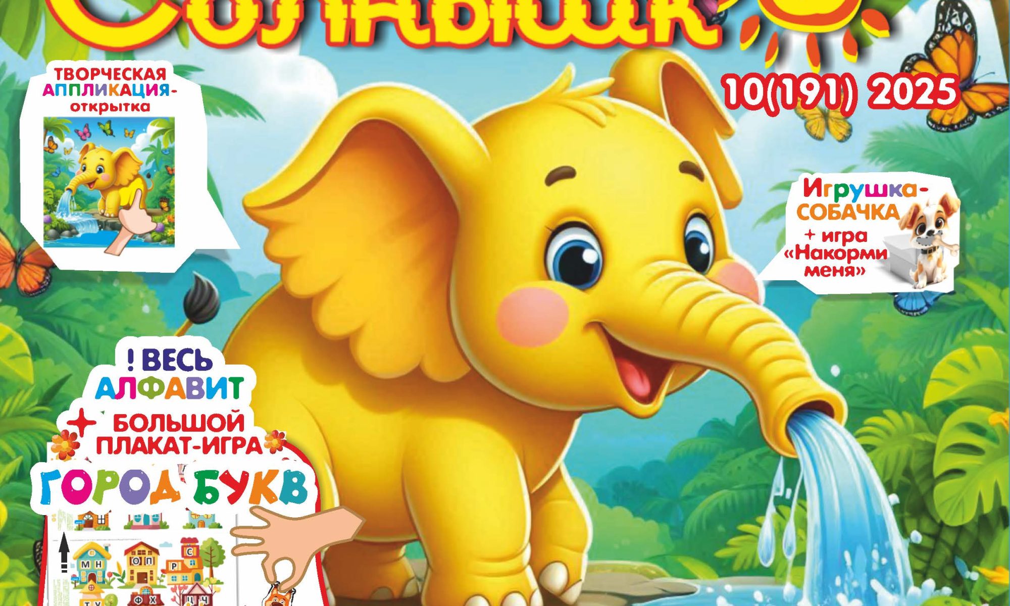 Мамино солнышко №10 2025 Игрушка Щенок и игра «Покорми меня», сказка «Как пуф и гав-гавыч лужи мерили», открытка-аппликация «Слоник на речке»», Большой обущающий плакат «Город Букв»+ буквы-зверюшки (рассаживаем их по балкончикам домиков) ВЕСЬ АЛФАВИТ!