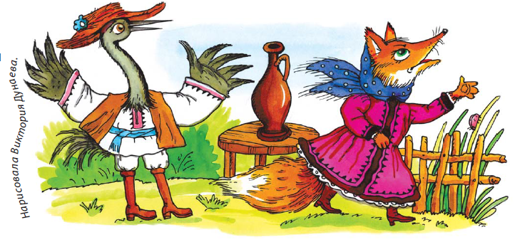 Лисичка с Журавлём очень подружились. Вот Лисичка и зовёт Журавля к себе в